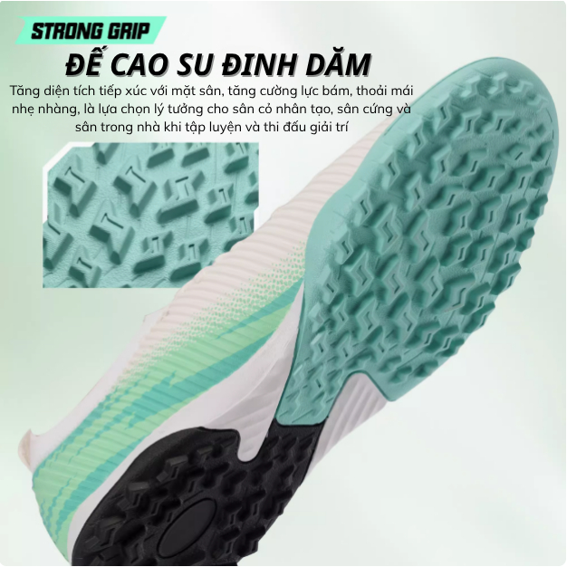 LARA STAR LS0058 được trang bị đế cao su đinh dăm bám sân cực tốt, giúp người chơi dễ dàng di chuyển, giữ thăng bằng và đổi hướng linh hoạt. Cấu trúc đinh dăm phân bố khoa học, tăng độ ma sát với mặt cỏ mà vẫn đảm bảo độ êm ái khi tiếp đất. Dù bạn là hậu vệ chắc chắn, tiền vệ linh hoạt hay tiền đạo bứt tốc, LS0058 đều mang đến cảm giác ổn định trong từng bước chạy.