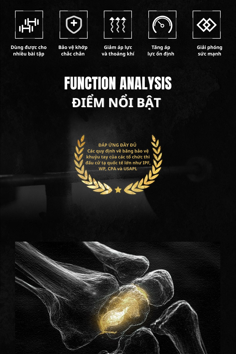 - Đạt Chuẩn Thi Đấu Quốc Tế: Sản phẩm đáp ứng đầy đủ các quy định nghiêm ngặt về băng bảo vệ khuỷu tay của các tổ chức thi đấu cử tạ lớn trên thế giới như IPF, WP, CPA và USAPL.