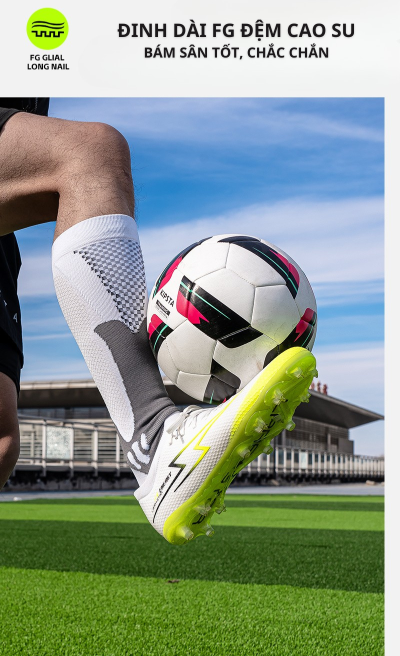- Thiết kế đinh dài FG: Đế giày sử dụng đinh dài đệm bằng cao su với độ bám sân vượt trội, giúp bạn tăng tốc, đổi hướng và phanh gấp một cách an toàn, chắc chắn.