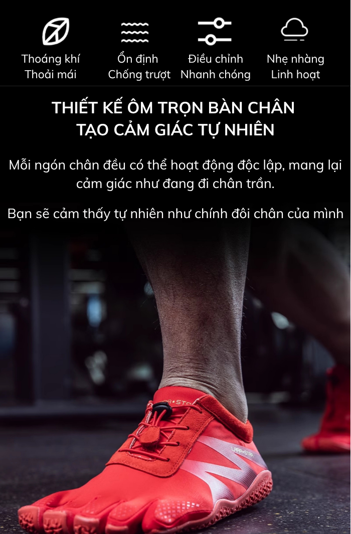 - Thiết Kế Độc Đáo 5 Ngón: Mỗi ngón chân đều có thể hoạt động độc lập, mang lại cảm giác tự nhiên như đang đi chân trần. Thiết kế này không chỉ giúp bạn tăng cường khả năng giữ thăng bằng và sự ổn định của cơ thể mà còn giảm nguy cơ chấn thương.