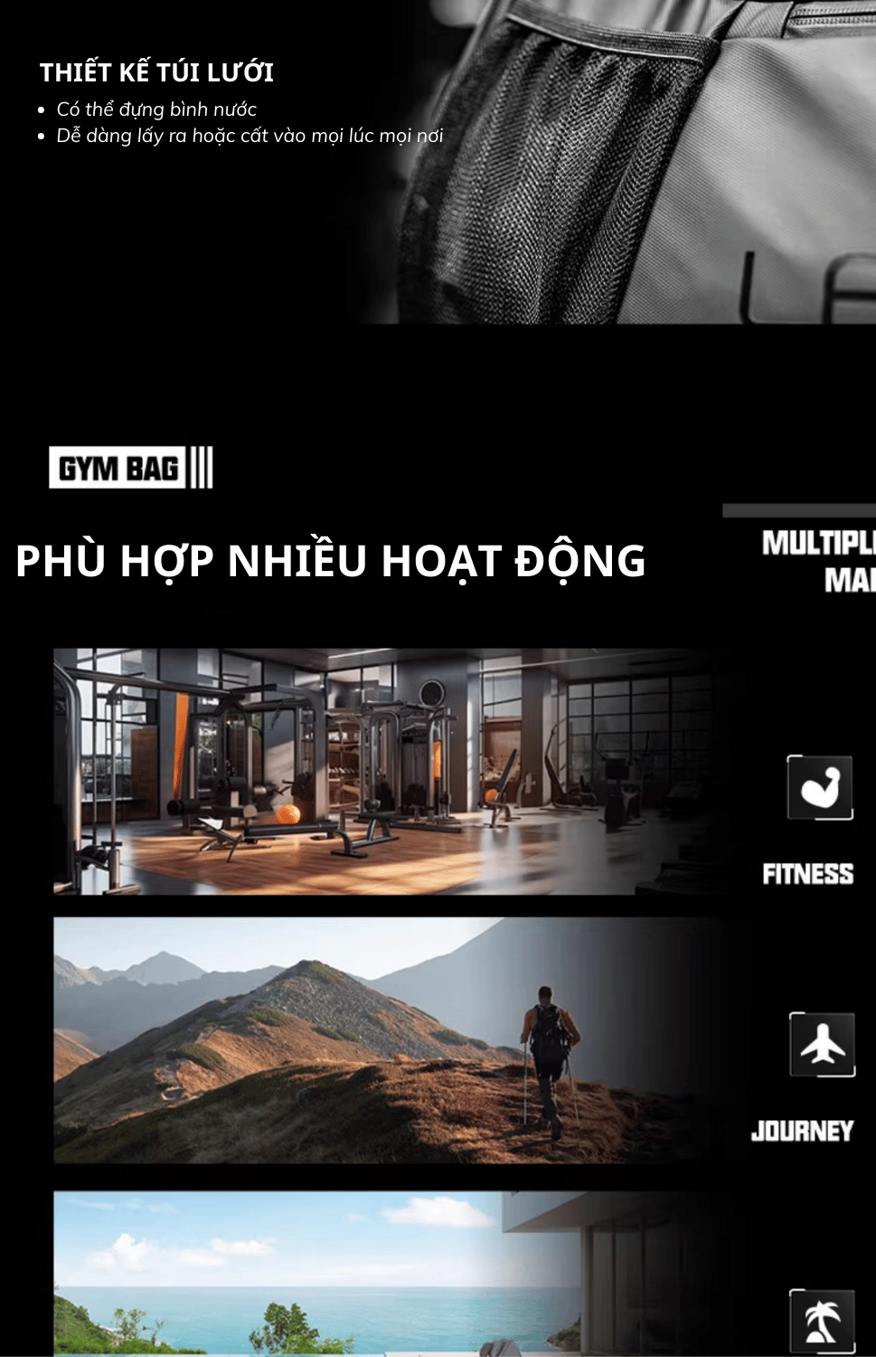 Tập Gym & Thể thao: Sức chứa lớn, đủ cho quần áo, phụ kiện tập và giày.